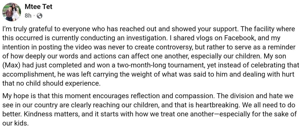 "My son (Max) had just completed and won a two-month-long tournament, yet instead of celebrating that accomplishment, he was left carrying the weight of what was said to him and dealing with hurt that no child should experience."