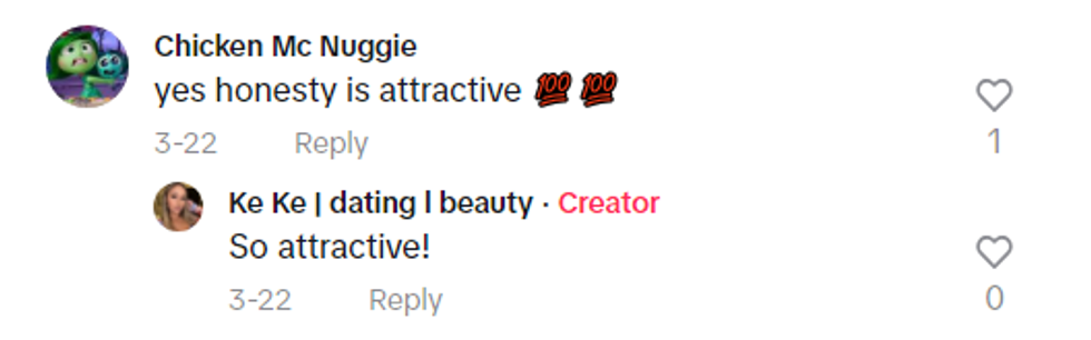 Ke Ke also noted when they first started talking that her future boyfriend was "love bombing" her because she was a "whole other league of women" than the women he had dated in the past. She told him to "slow his roll" and stated that his infatuation with her and the relationship would start to wane around three months into the relationship.