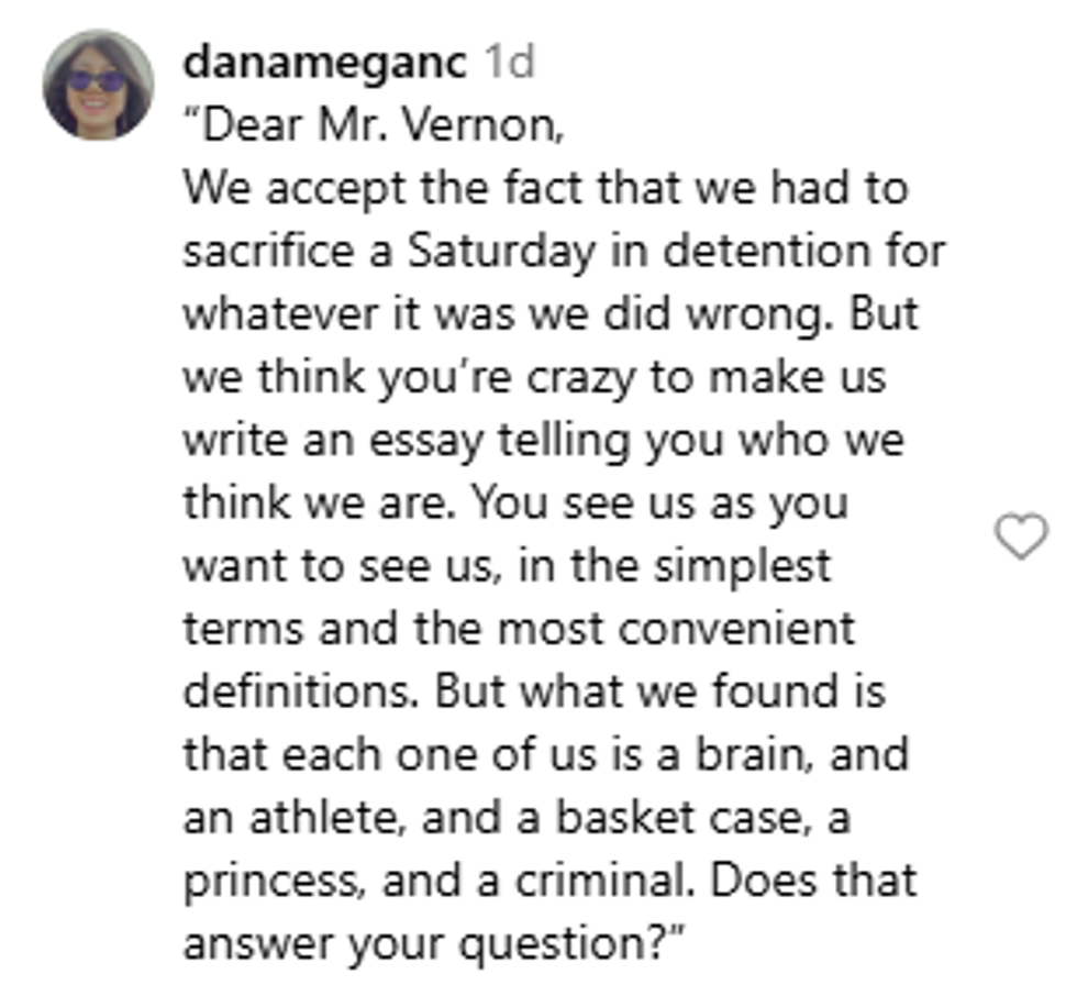 "And when you think about trying to pitch this movie today, and it’s about five kids sitting in a library all day in detention , the studio executives would march you right out the door and say, 'Where are the monsters? Where’s the car chases? Where are the big effects?'"