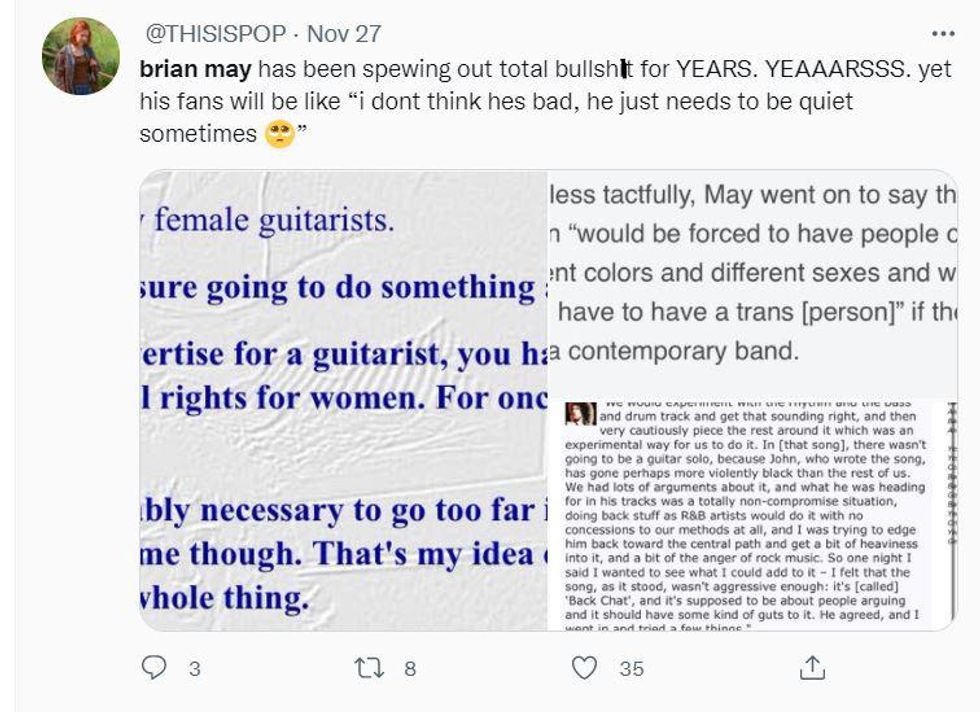 Ok so Brian May says he’s not anti-trans, which is great! BUT there’s a big difference between ‘I didn’t say that’ and ‘my words were subtly twisted’, so I’d love to know what his words actually were 🤔 pic.twitter.com/rcKdWMM1FK
