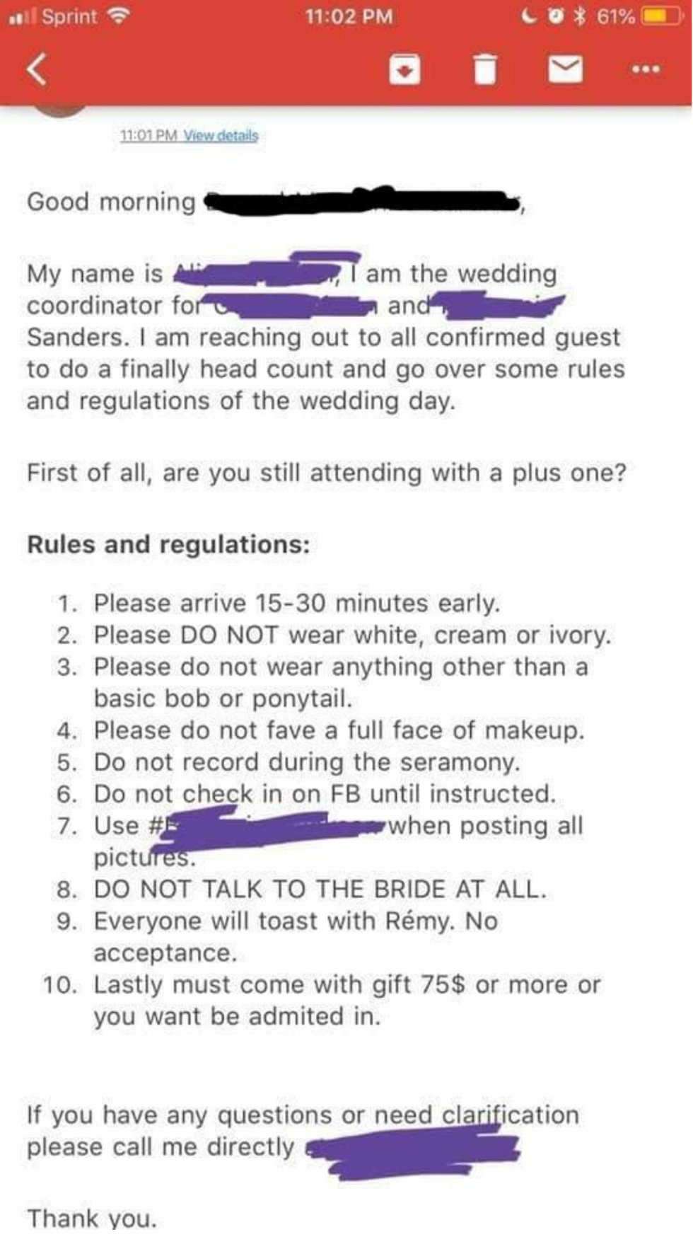 One wedding coordinator appeared to risk being killed as a messenger for sending out a detailed list of "rules and regulations" on behalf of the client.