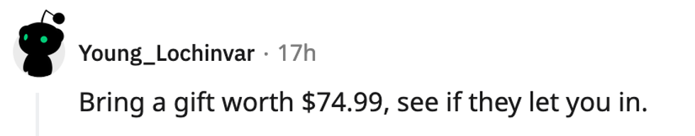 The final rule required guests to bring a wedding gift with a value of $75 or more if they wanted to have guaranteed admission to the ceremony and reception.