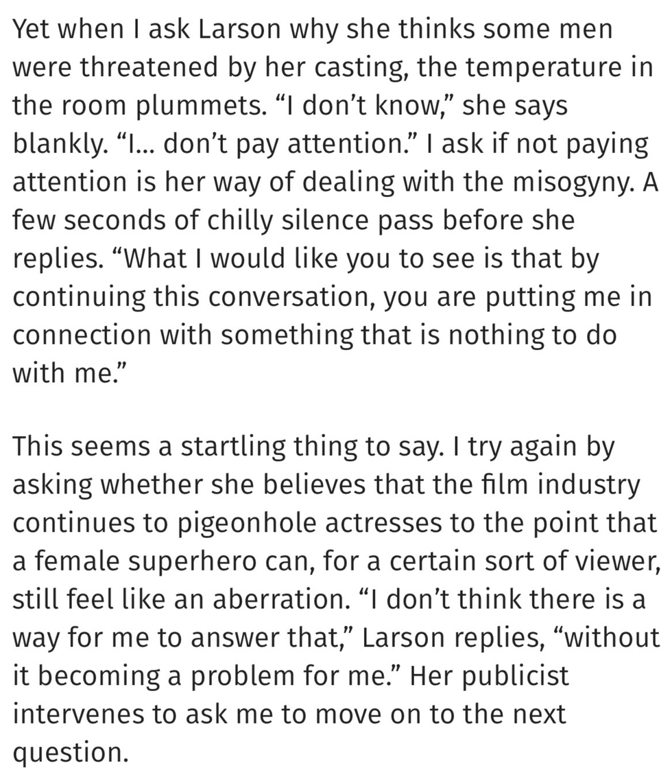 However, when Allfree asked the Room actor "why she thinks some men were threatened by her casting," Larson's response indicated she was done talking about toxic Marvel fanboys.