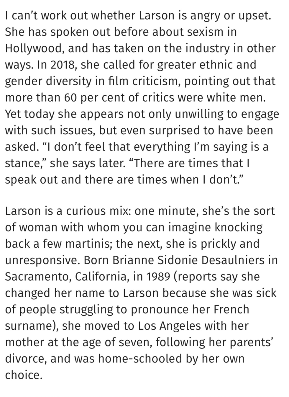 The flummoxed reporter even called out Larson's tendency to waver from being "the sort of woman with whom you can imagine knocking back a few martinis" to being "prickly and unresponsive."