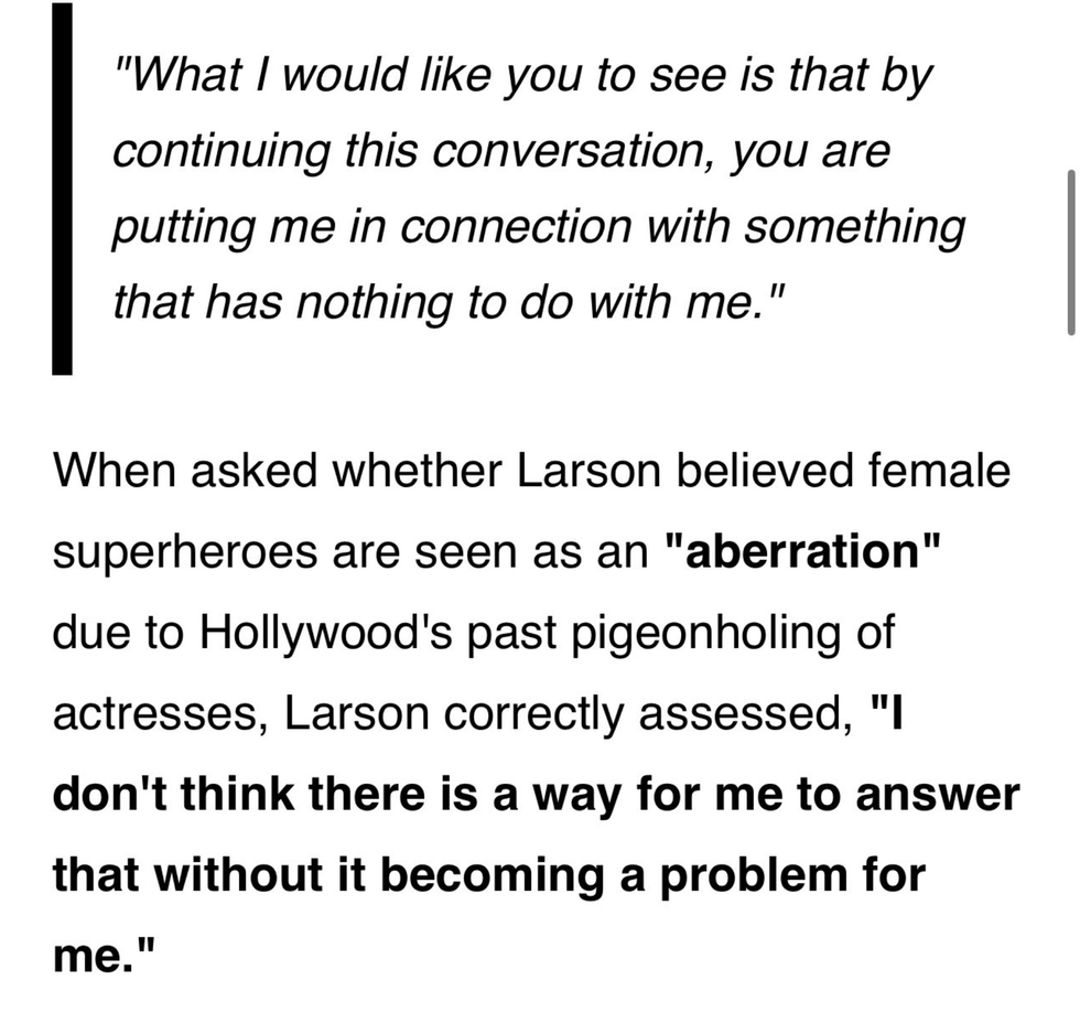 X user Disparu gave Larson props and shared a screenshot from a different point in the interview where the reporter pressed the actor on whether "female superheroes are seen as an 'aberration' due to Hollywood's past pigeonholing of actresses."