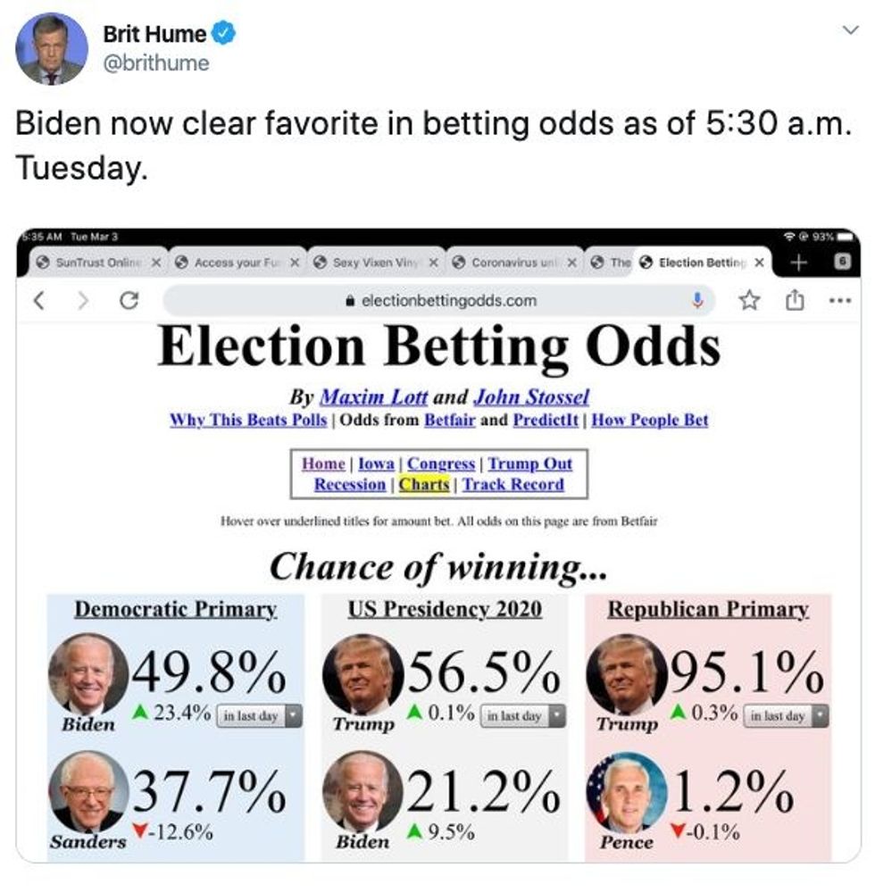 Eager to show the world the betting odds in the 2020 presidential primary open on his computer, he quickly took a screenshot and tweeted it out.