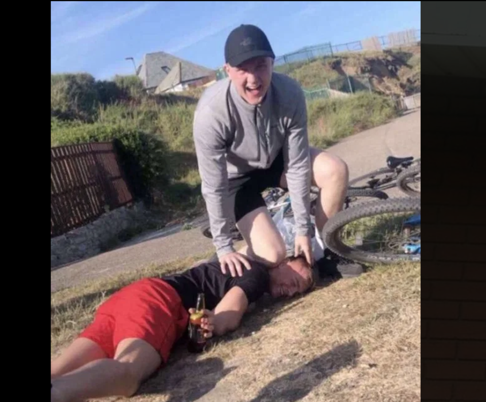 One teen is seen sprawled across the ground while another kneels on his neck.