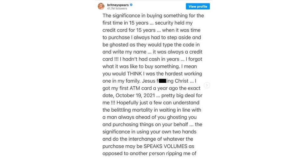 In her post, Spears described the experience of having all of her money and credit cards controlled by her security detail for 15 years.