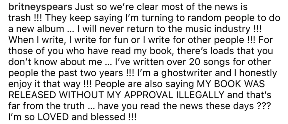 In a lengthy and now-deleted post, the "Oops... I Did it Again" singer swore the "news" is absolutely false, noting that she will "never return to the music industry."