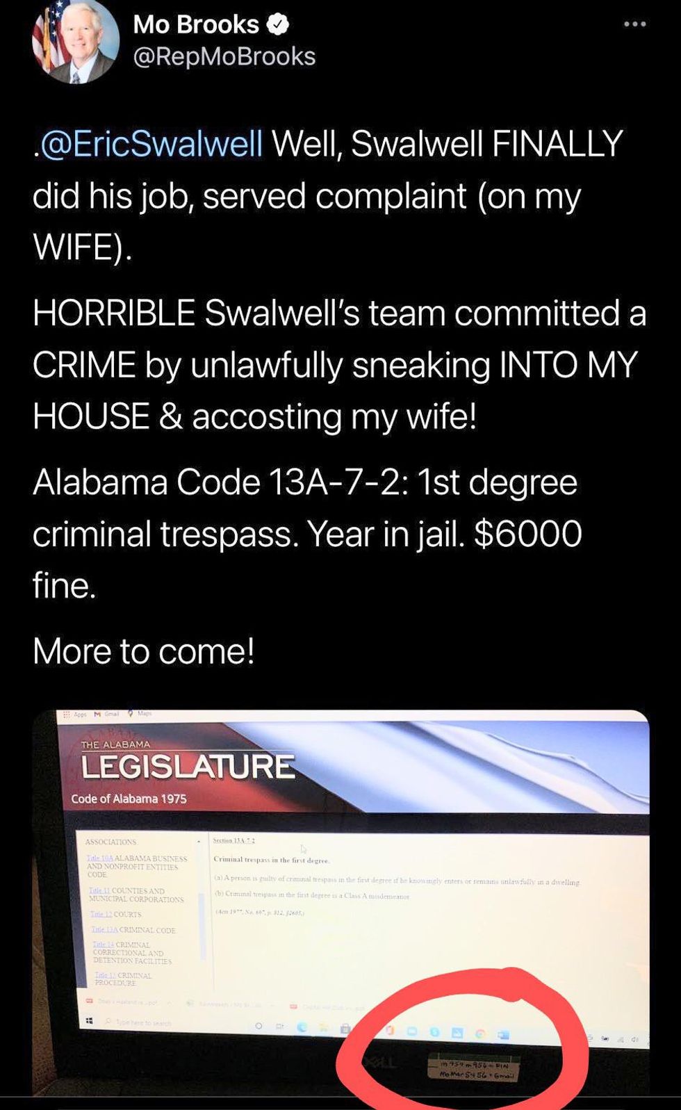 .@EricSwalwell Well, Swalwell FINALLY did his job, served complaint (on my WIFE).\n\nHORRIBLE Swalwell\u2019s team committed a CRIME by unlawfully sneaking INTO MY HOUSE & accosting my wife!\n\nAlabama Code 13A-7-2: 1st degree criminal trespass. Year in jail. $6000 fine.\n\nMore to come!pic.twitter.com/XSrFnezDlC— Mo Brooks (@Mo Brooks) 1623008949