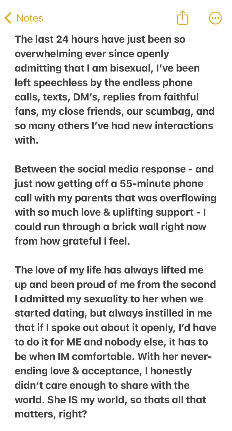 “The last 24 hours have just been so overwhelming ever since openly admitting that I am bisexual,” he wrote.