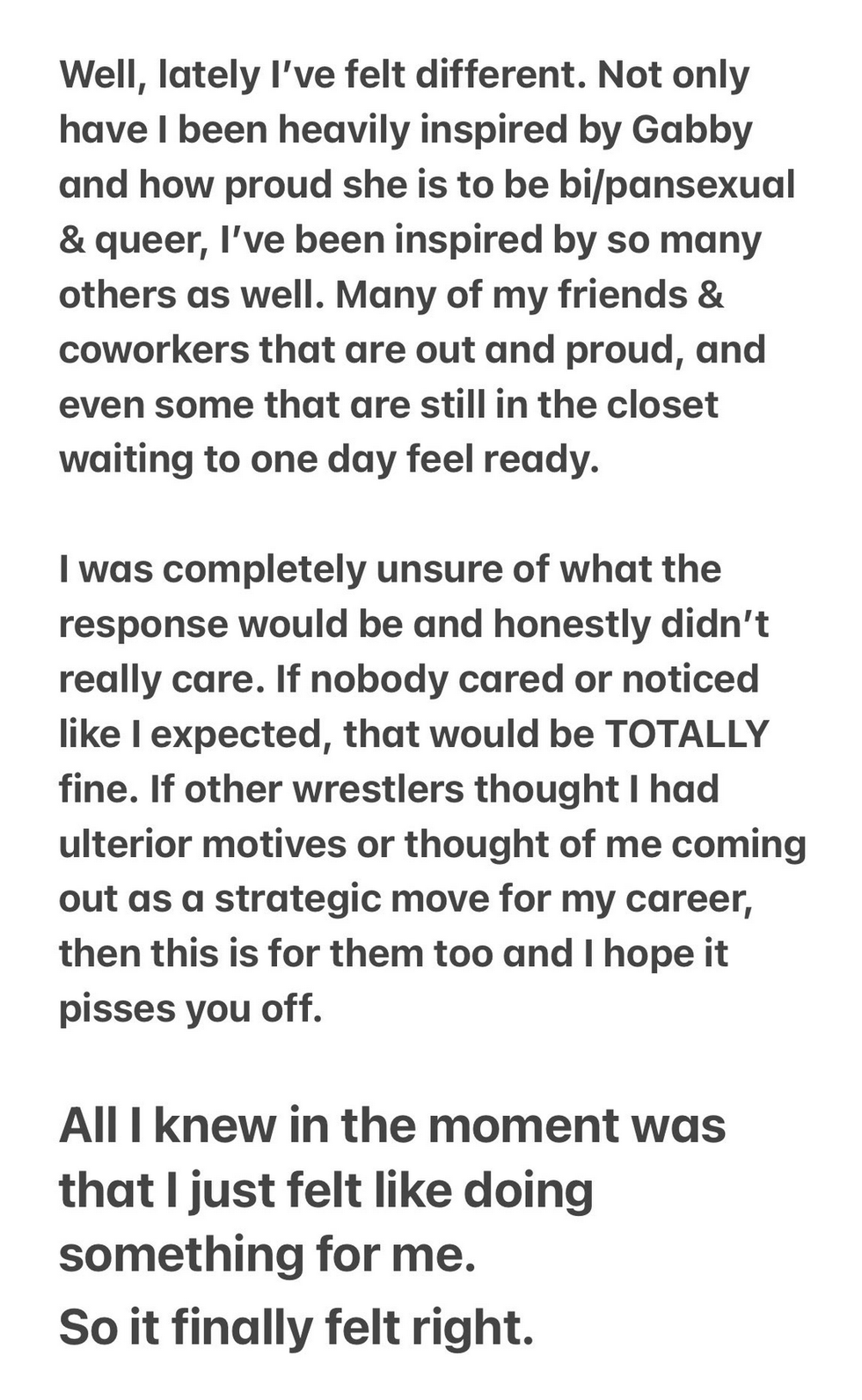 "If other wrestlers thought I had ulterior motives or thought of me coming out as a strategic move for my career, then this is for them too, and I hope it pisses you off."