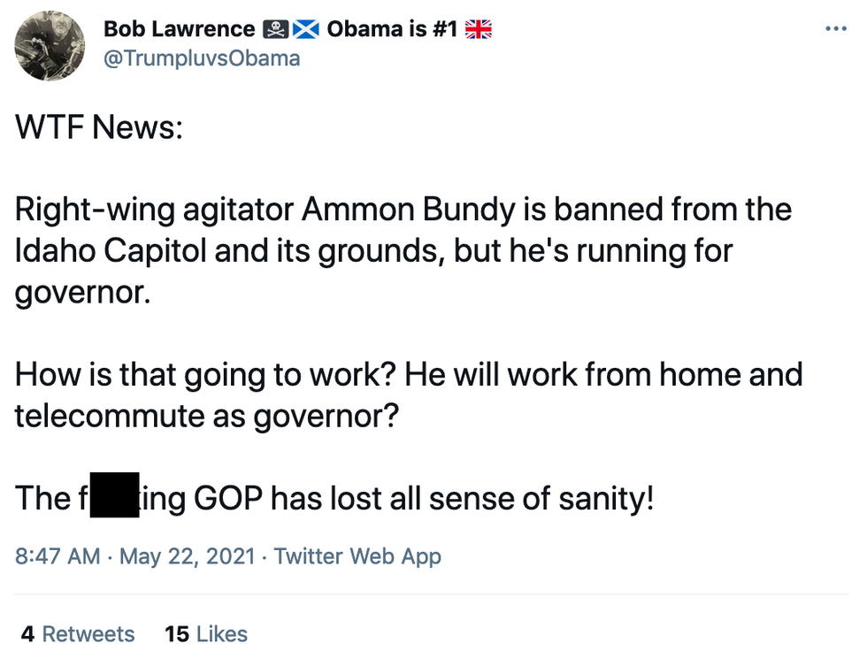 Ammon Bundy Hates The Government So Much He Wants To Be Governor Of Idahohttps://www.wonkette.com/ammon-bundy-hates-the-government-so-much-he-wants-to-be-governor-of-idaho\u00a0\u2026— Wonkette (@Wonkette) 1621710586