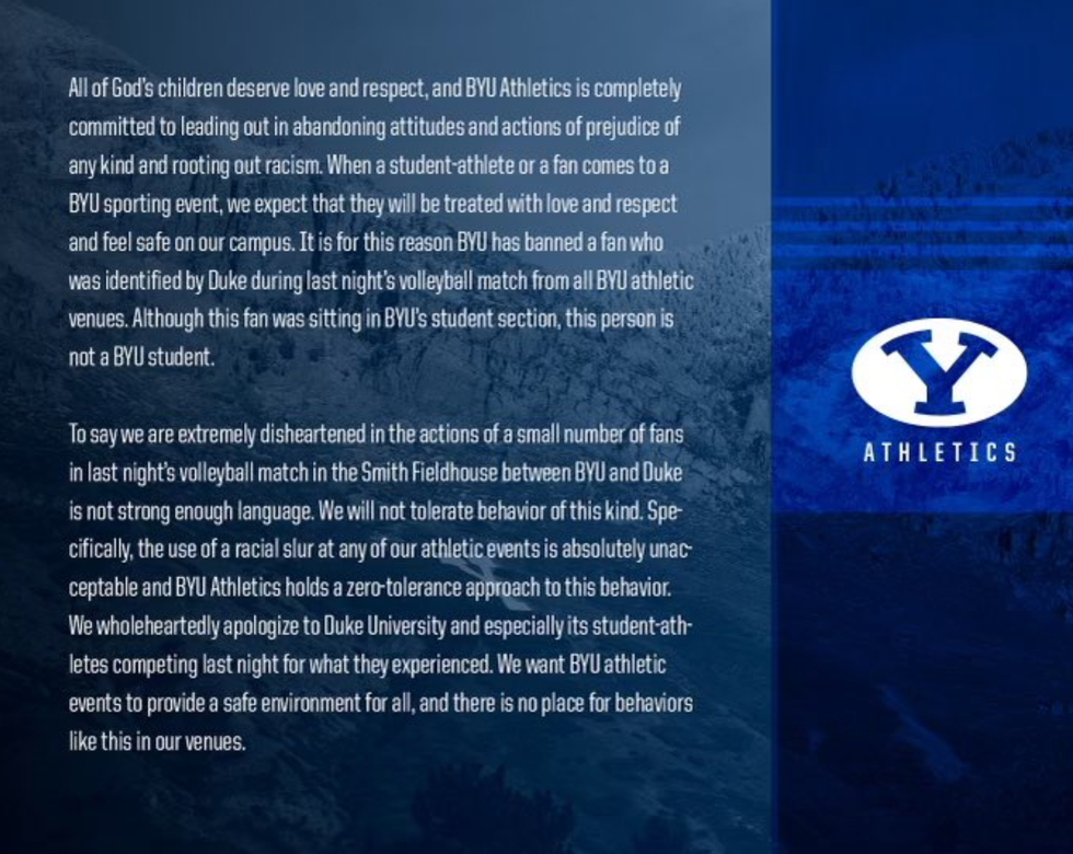 "We will not tolerate behavior of this kind. Specifically the use of a racial slur at any of our athletic event is absolutely unacceptable and BYU Athletics holds a zero-tolerance apporach to this behavior."
