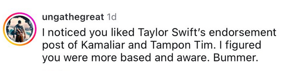 Clark was among the many celebrities—including actors Reese Witherspoon and Viola Davis, music artists Sabrina Carpenter and Charli XCX, and even Oprah—who smashed the "like" button on Swift's post in which she signed off and included a photo of herself as a "Childless Cat Lady," a jab at Trump's VP pick JD Vance's demeaning comment towards women voters.