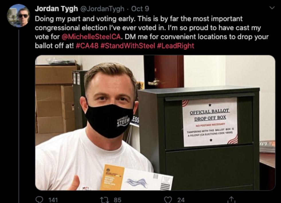 A since-deleted tweet from California GOP Regional Director Jordan Tygh raised eyebrows when Tygh pictured himself with a ballot next to one of the fraudulent boxes, labeled "Official Ballot Drop Off Box."