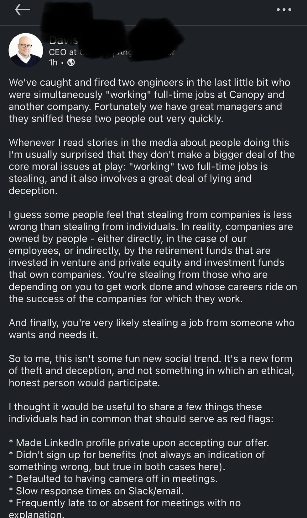 In a LinkedIn post he wrote earlier this month, Bell said his team "caught and fired two engineers in the last little bit who were simultaneously 'working' full-time jobs at Canopy and another company."
