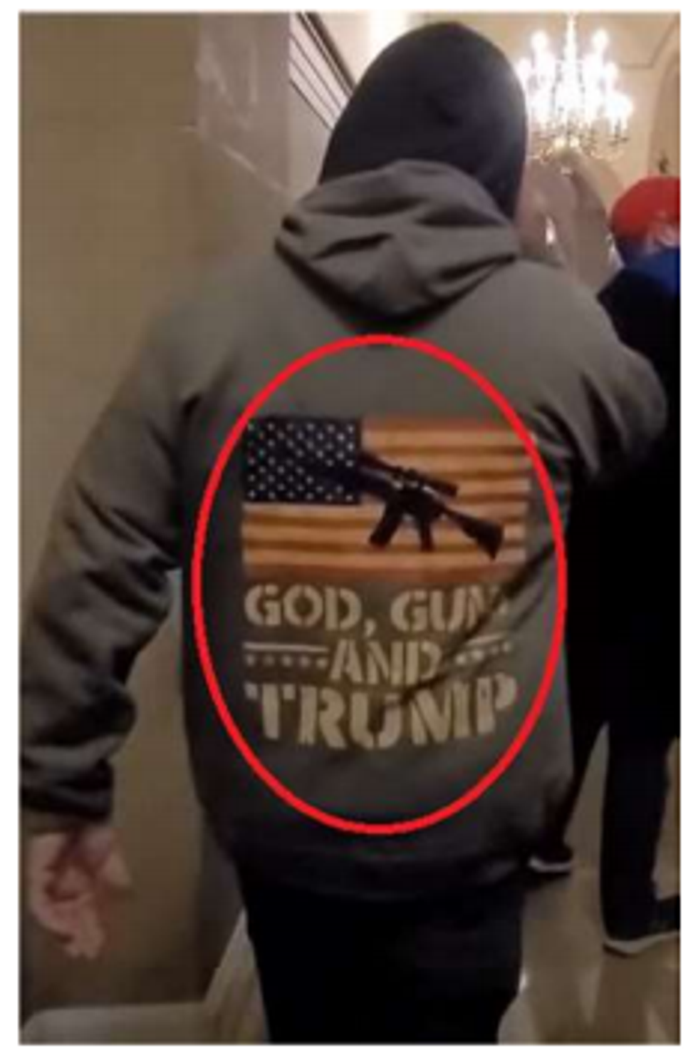 "Over that, Register was wearing a green or gray hoodie sweatshirt, the back of which featured an American flag and lettering that stated, 'God, Guns, & Trump.'"
