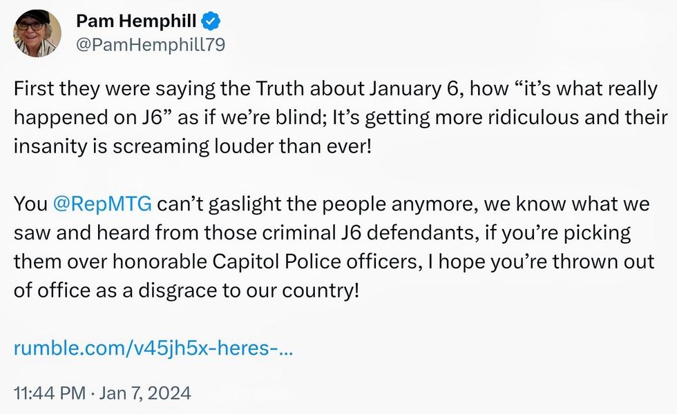 "You [Georgia Republican Representative Marjorie Taylor Greene] can't gaslight the people anymore, we know what we saw and heard from those criminal J6 defendants, if you're picking them over honorable Capitol Police officers, I hope you're thrown out of office as a disgrace to our country!"