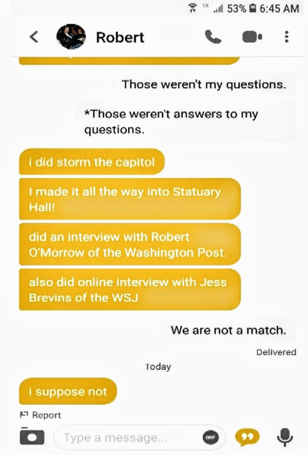 According to court filings, Chapman had matched with someone on the dating app Bumble. However, their would-be date didn't appreciate Chapman's story of what he did on January 6.
