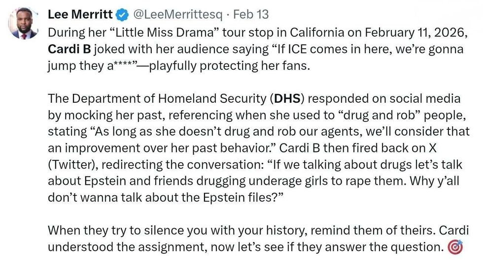 The feud began on Wednesday, February 11, after Cardi B told attendees at the Palm Desert, California, stop of her Little Miss Drama tour what would happen if DHS's Immigration and Customs Enforcement (ICE) agents attacked her fans at her concerts.