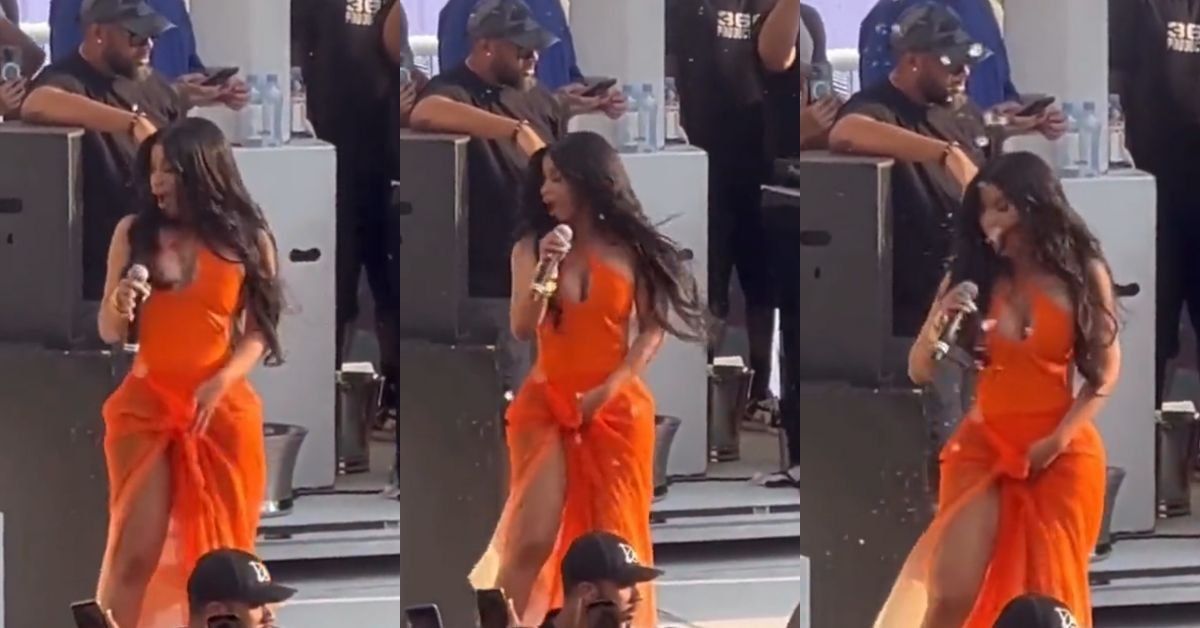 When an unruly audience member tossed a drink in her direction, a startled Cardi B threw her handheld mic at the culprit while the track to her song “Bodak Yellow” continued playing.