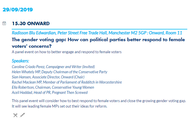 According to the brochure, she had been invited to participate in a panel discussion on “The gender voting gap: How can political parties better respond to female voters' concerns?"