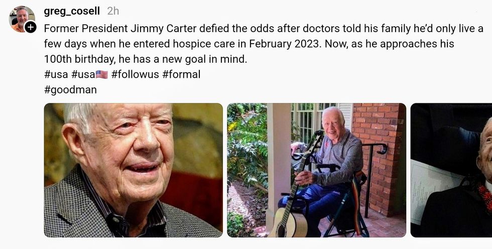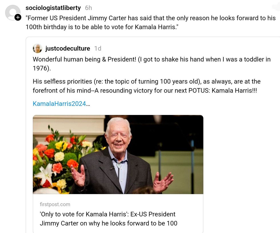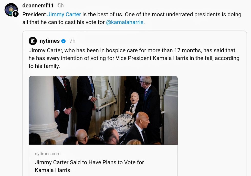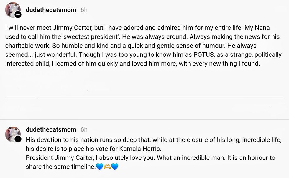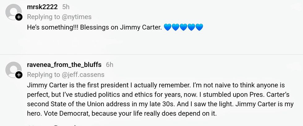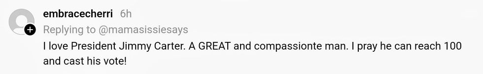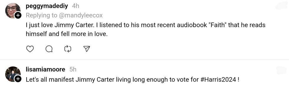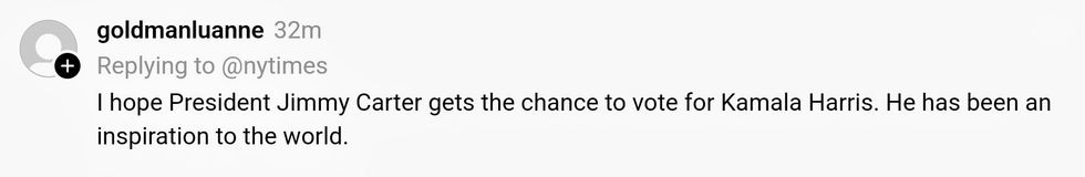 Carter's sentiments about wanting to make it long enough to vote for Harris were shared with the newspaper by his grandson, former Georgia state Democratic Senator Jason Carter.