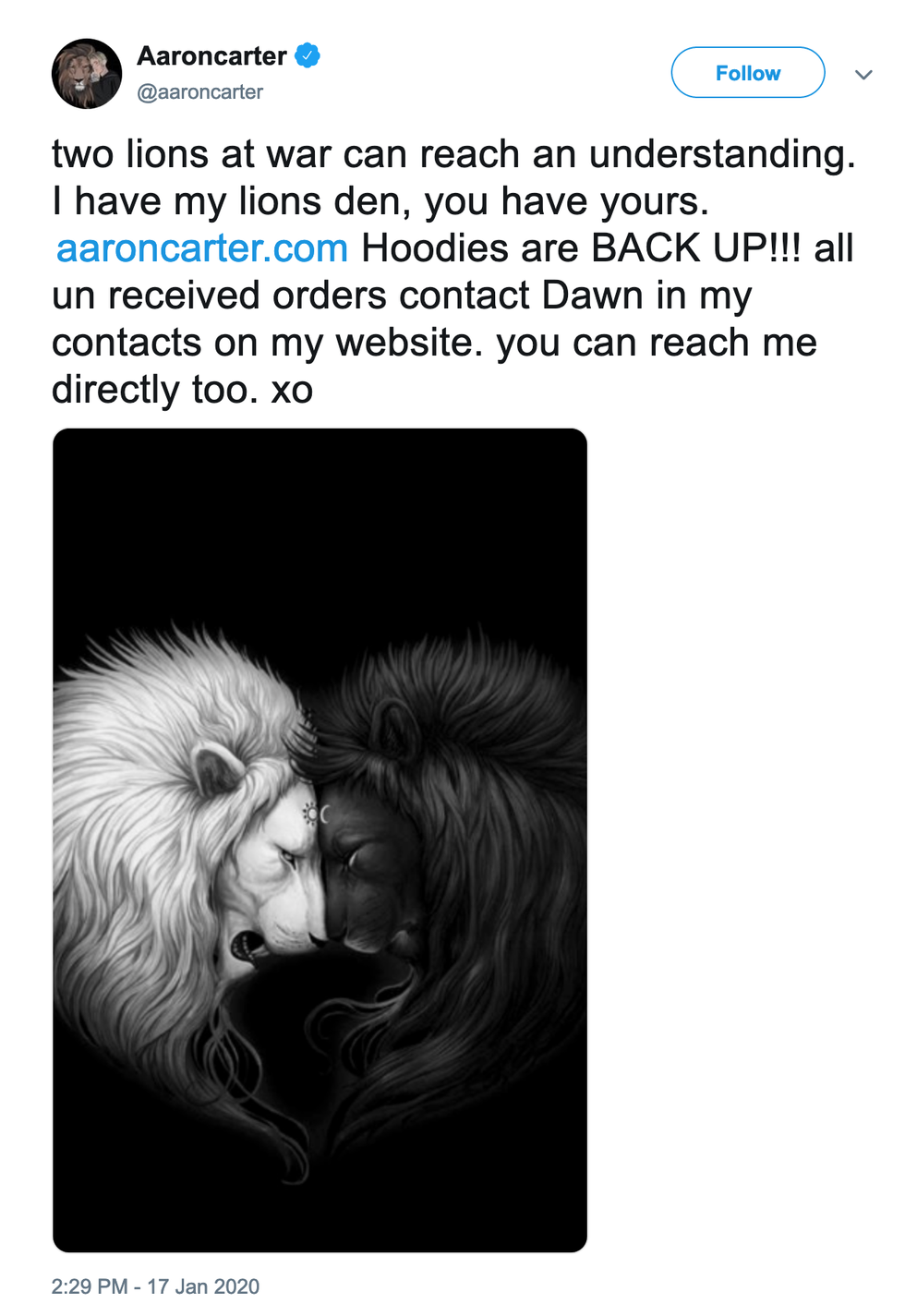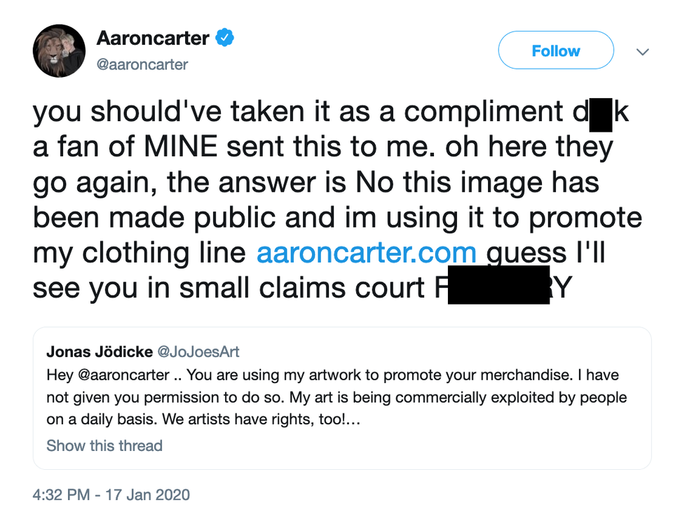"Hey @aaroncarter .. You are using my artwork to promote your merchandise."
