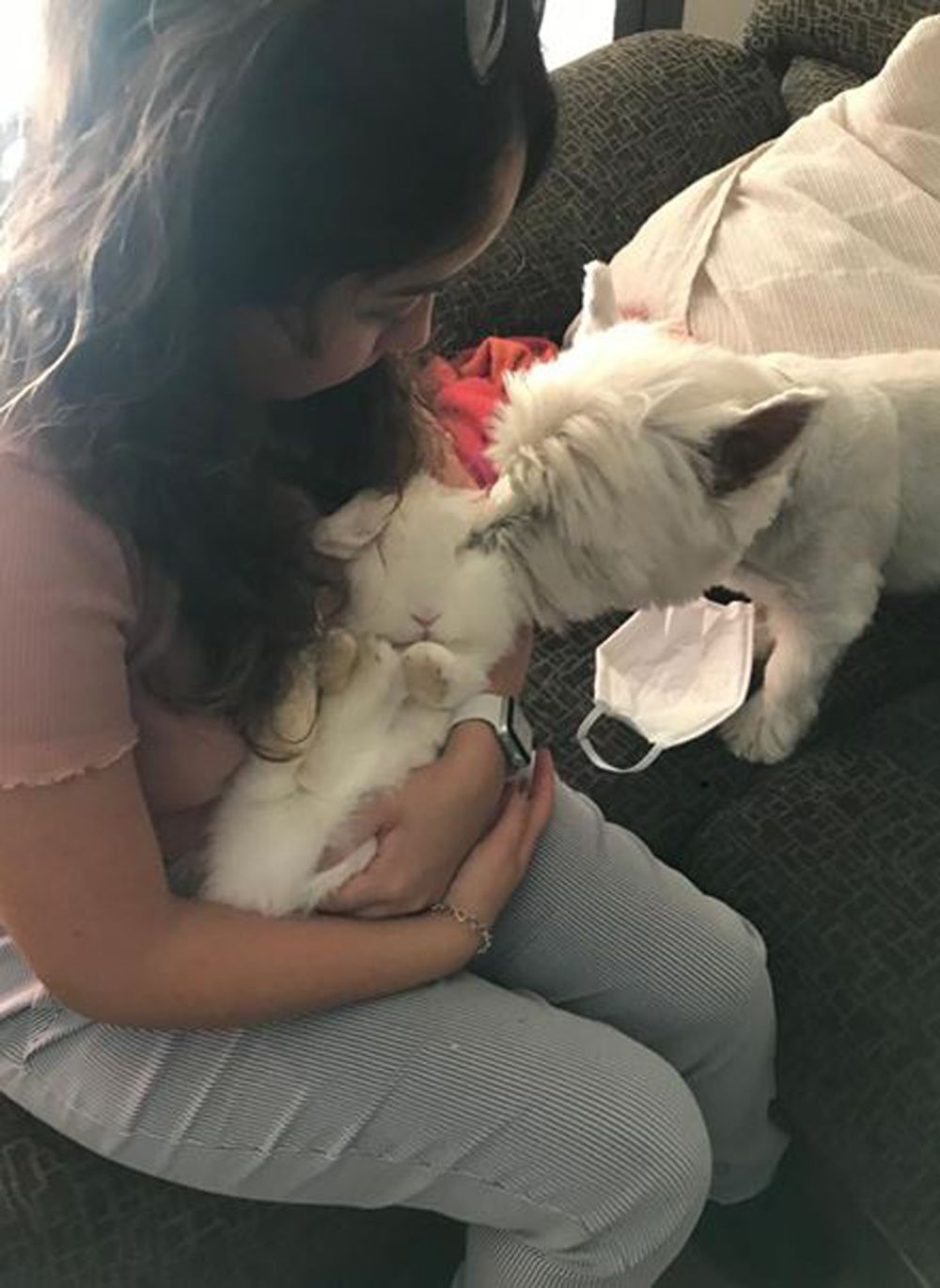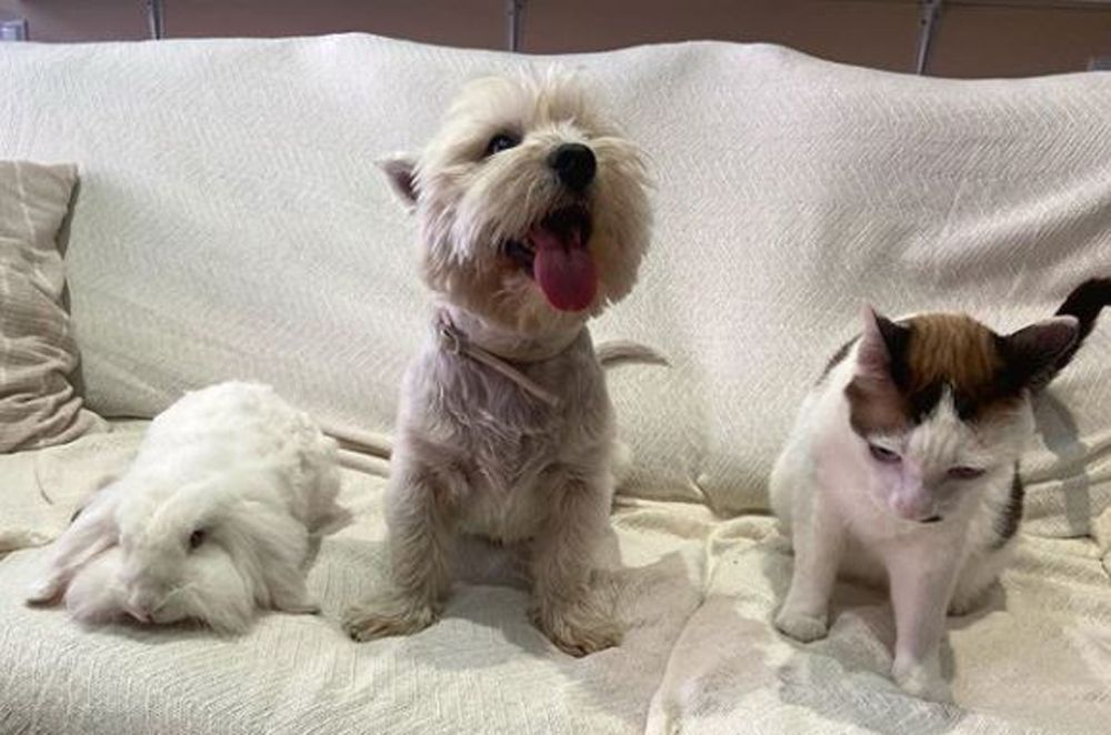 After successfully bonding her West Highland terrier Sam with her cat Rafa when he was a kitten, Michelle Borraz ignored her doubters and introduced long-haired rabbit Kaninchen to the pack.