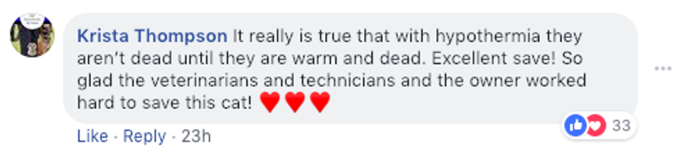 Fluffy was taken to the emergency room when doctors realized her temperature was still too low after about two hours of using warm water and blankets.