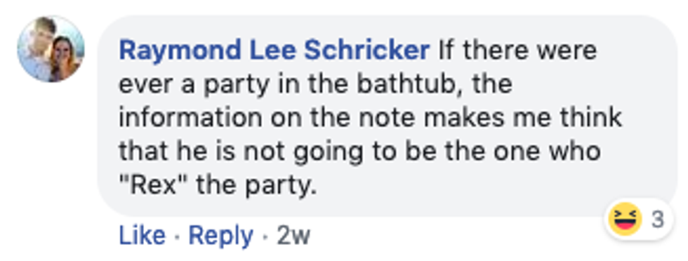 "Hello! This is your neighbor in the red house! We just wanted to let you know that Rex has developed a weird love for our bathtub + will sneak into our home to sit in it! All of us in the house are 100% okay with this because we all love Rex very much. We just want to let you know in case you were wondering where he was one of these days … he's probably in our bathtub. <3 The Red House."