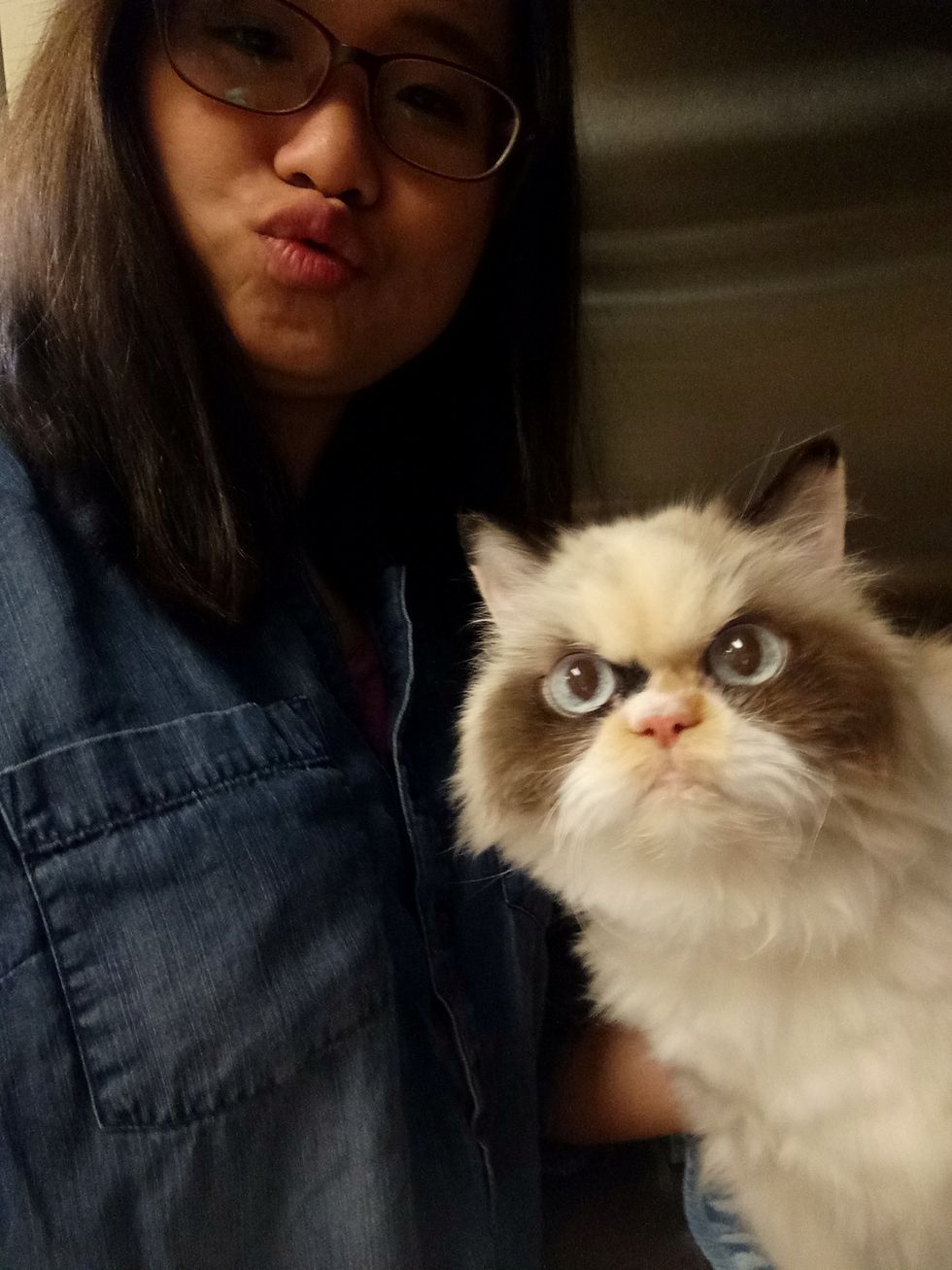 "I adopted her around 10 years ago. I support 'adopt, don't shop.' Since I have my cats, they have taught me a lot things."