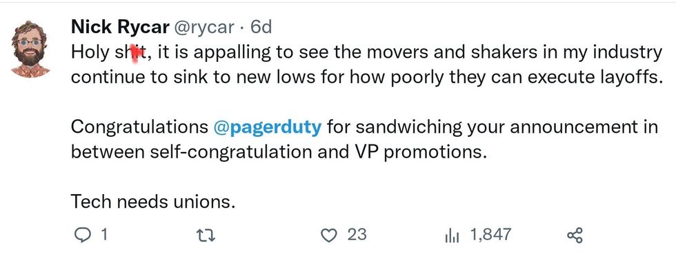 \u201cThe most tone-deaf layoff email I read so far was written yesterday, and it comes from PagerDuty CEO Jennifer Tejada.\n\nThe email is vey long, and feels like it was written by an AI that took all the phrases that people usually say, and put it one long email.\n\nSee for yourself:\u201d— Gergely Orosz (@Gergely Orosz) 1674647608