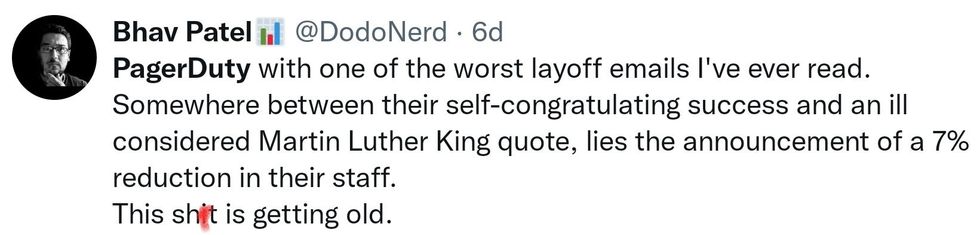 \u201c\ud83d\udc4b @pagerduty \n\nMaybe don't quote MLK when firing 7% of your workforce? https://t.co/Zf4VCyy800\n\n(and yes I'm dunking but I think something broke inside of me today when a friend texted me this in light of the last few weeks / months... JFC so many idiots wielding power)\u201d— Noah Chestnut (@Noah Chestnut) 1674586810