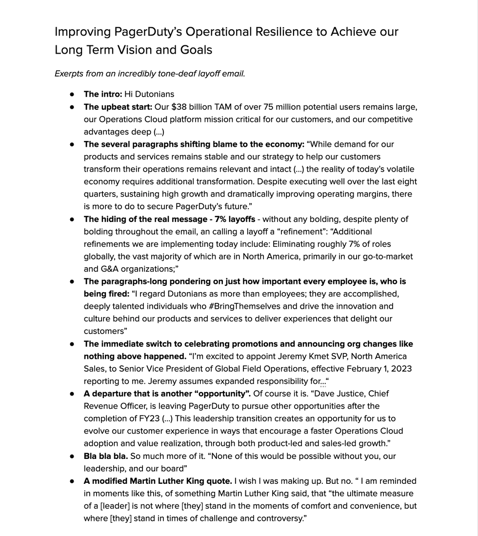 \u201cAll time classic bad layoff announcement: CEO of PagerDuty opens with "Hi Dutonians," takes 370 words to get to the layoffs bit, continues for another *1250 words*, and ends with "I am reminded in moments like this, of something Martin Luther King said..." https://t.co/OAg4SjqYIm\u201d— Tom Gara (@Tom Gara) 1674598203