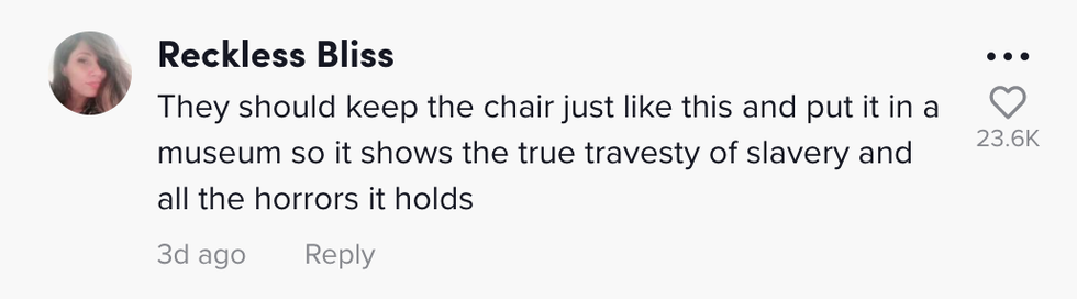 But many followers agreed this chair should be in a museum, as is, as a reminder of our troubled past and all the horrors slaves had to endure.