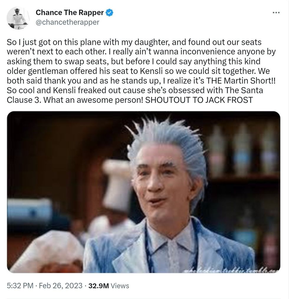 \u201c@chancetherapper You know what\u2019s even cooler .. Martin Short is probably telling someone else right now how he got to meet Chance the Rapper on a plane tonight.\u201d— Chance The Rapper (@Chance The Rapper) 1677450728
