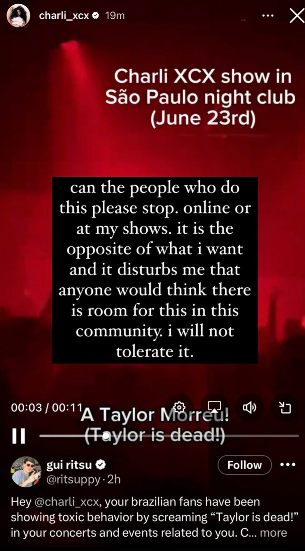 “Hey @charli_xcx, your Brazilian fans have been showing toxic behaviour by screaming ‘Taylor is dead!’ in your concerts and events related to you."