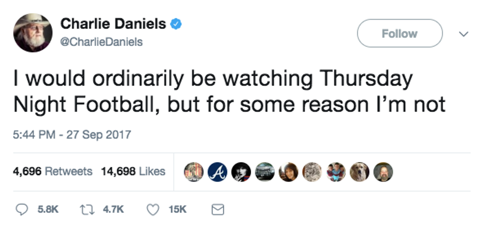 Along with many Trump supporters, the "Devil Went Down To Georgia" singer has stopped watching football games, which he made clear on Twitter earlier this week: