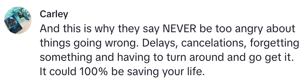 In this situation, James' delayed flight potentially caused a chain reaction that prevented him from being at the wrong place at the wrong time.