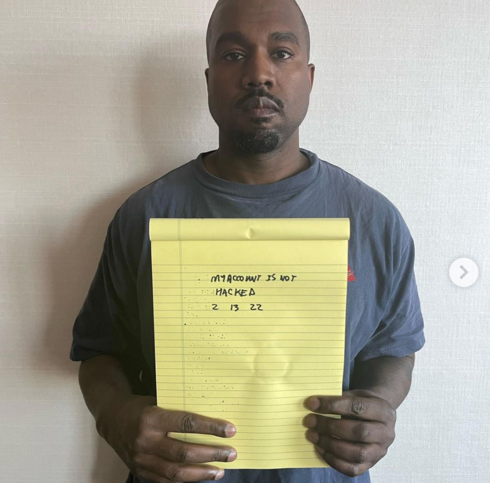 The posts were so wild, West posted pictures of himself holding a yellow notepad with the written message, “My account is not hacked 2 13 2022," as proof it was truly him running the account.