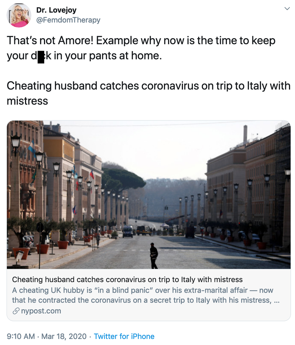 A cheating husband is in a "blind panic" after contracting the coronavirus while on a secret rendezvous with his mistress in Italy–where there has so far been 35,713 confirmed cases and 2,978 deaths reported.