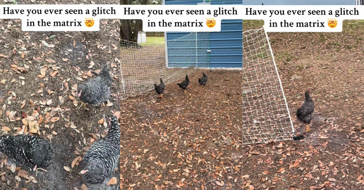 The TikToker decided to record a video of her chickens as she called them over to eat—but as they started to follow her, one deviated away from the group and gave a low growl sound. Then all five chickens froze in place mid-step.