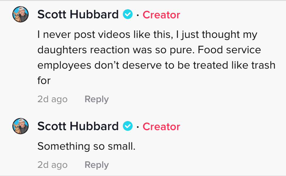 "I never post videos like this, I just thought my daughters reaction was so pure. Food service employees don't deserve to be treated like trash for something so small."