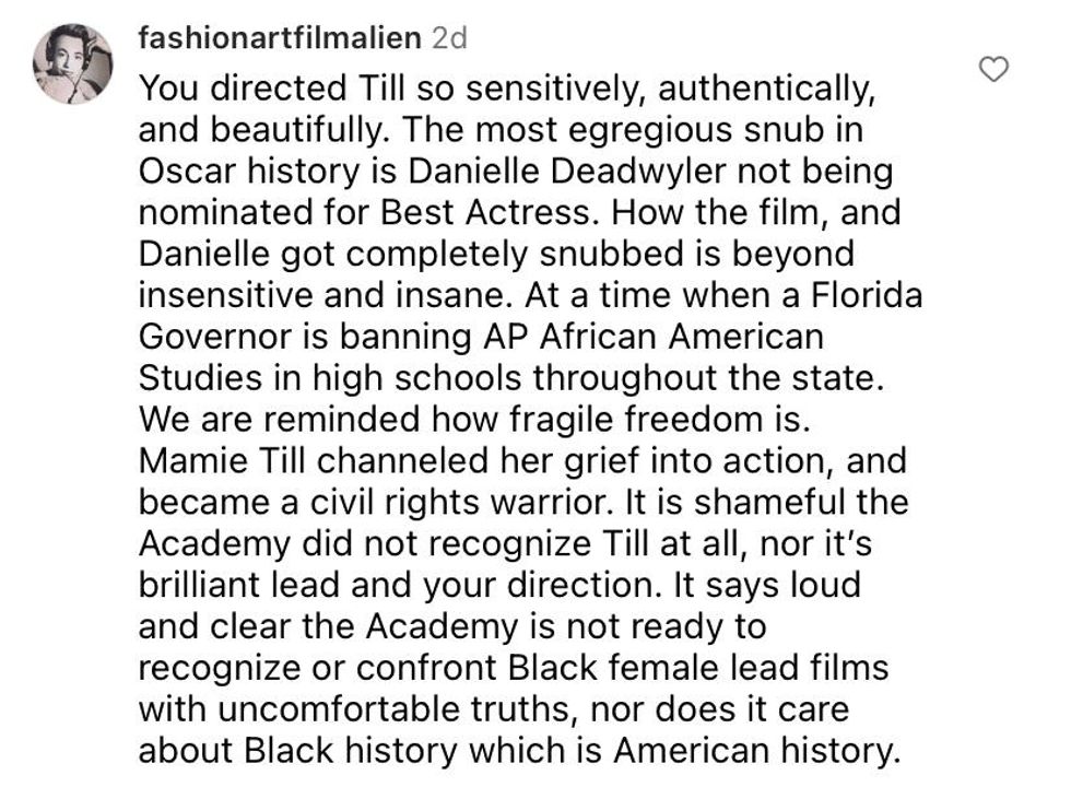 Till is a film based on the true story of the brutal 1955 lynching of 14-year-old Emmett Till and his mother's pursuit of justice. The film's lead Danielle Deadwyler had generated a great deal of Oscar buzz for her performance as Mamie Till-Mobley, but neither she nor any other Black actors were on the lead acting shortlists.