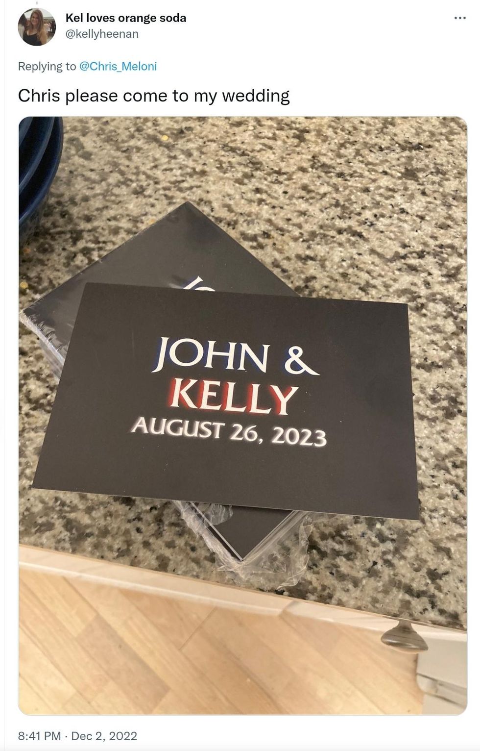 \u201c@kellyheenan @Chris_Meloni Your invitations are FABULOUS!!!!! \n\nChris! The bride deserves a better response than, "And do what?"\u201d— Chris Meloni (@Chris Meloni) 1670022968