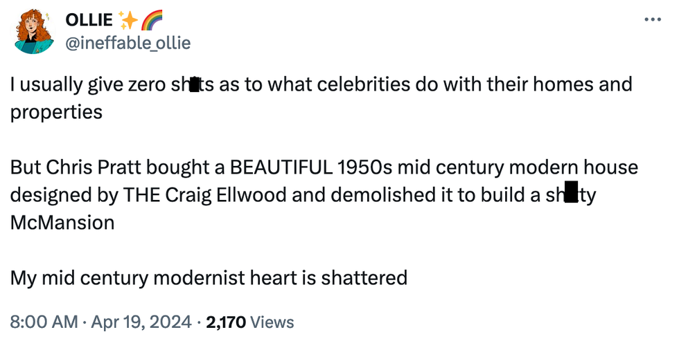 Chris Pratt and Katherine Schwarzenegger demolished a Craig Ellwood, and the internet is furious: https://t.co/GWqBkscBP7 pic.twitter.com/LQDo13zqK7