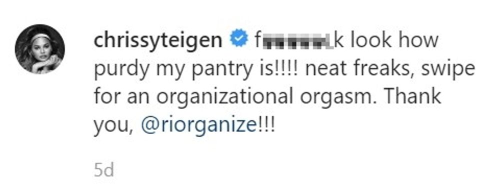 Most recently, Teigen showed off her pantry, promising an "organizational orgasm" in a series of pictures.