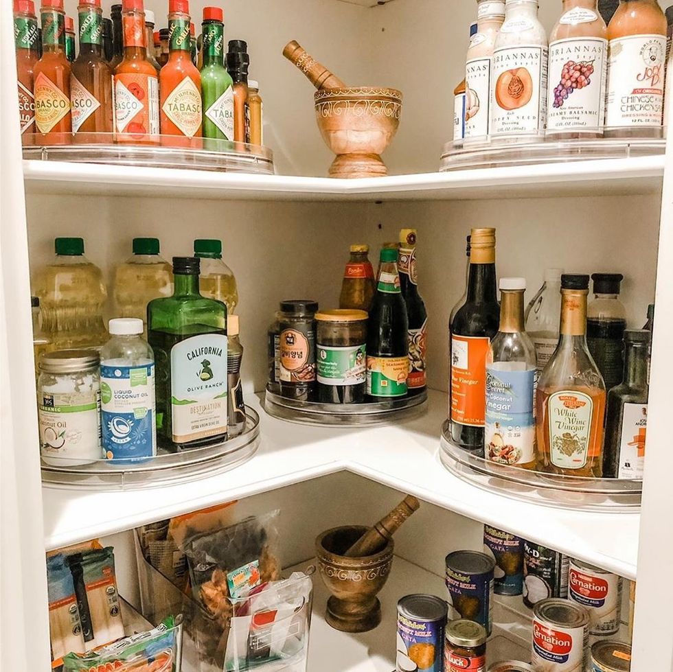 Clear and labeled bins, tiered shelves, and Lazy Susans keep things neat but also easily accessible. The whole endeavor is very impressive.